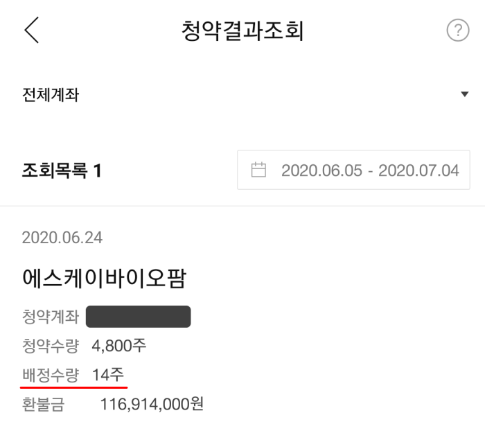 청약 마감일인 24일 당일에 대출금을 포함해서 1억 2천만 원 정도를 한화투자증권을 통해서 SK바이오팜 공모주 청약을 신청했습니다. 예상대로 경쟁률은 300대 1을 훌쩍 넘어섰고 총 14주를 배당받을 수 있었습니다. 청약증거금 중 14주에 대한 매수금액 68만 6천 원을 제외한 나머지 금액은 청약 마감 이틀 뒤인 26일에 환급받았고 대출금은 이틀 치 이자를 포함해서 곧바로 중도상환할 수 있었습니다.