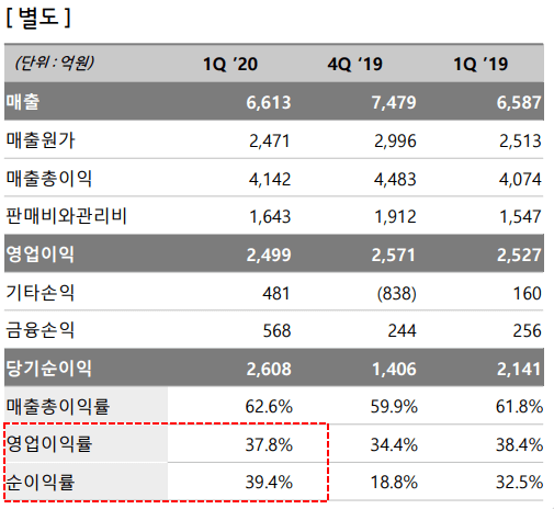 KT&G의 재무건전성은 말이 필요 없을 정도로 좋아 보입니다. 부채 비율이 고작 24% 정도이고 반면에 영업 이익률은 2020년 1분기 기준 무려 37%가 넘습니다. 워런 버핏 할아버지도 말씀하셨듯이 역시 담배사업은 망하려야 망할 수가 없는 사업인 것 같습니다.