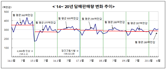 담뱃값이 큰폭으로 인상된 2015년을 제외하고 2016년부터 지금까지의 담배 판매량을 보면 월평균 300백만 갑을 꾸준히 유지하고 있습니다. 2017년부터 시행된 담뱃값 경고그림 제도도 판매량 추이에 큰 영향을 주지는 못한 것으로 보입니다.