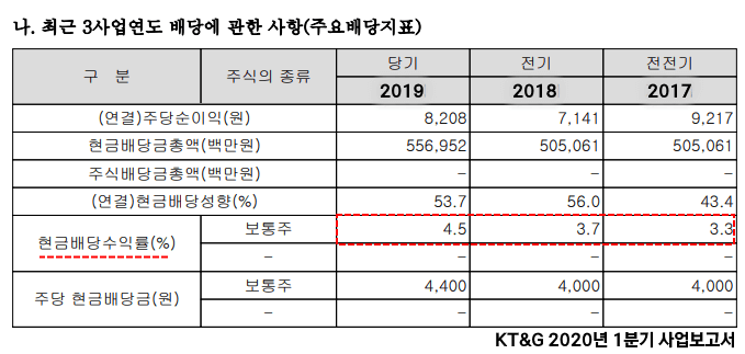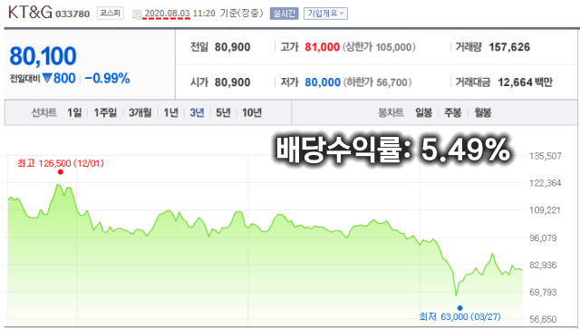 KT&G는 국내에 보기드문 고배당 주식입니다. 지난 3년간 순이익의 50% 정도를 배당금으로 지급해 왔으며 배당수익률도 꾸준히 우상향하고 있는 배당 성장주입니다. 게다가 최근 코로나 19로 인해 크게 하락한 주가가 좀처럼 회복하지 못하고 있어 2020년 8월 3일 기준 배당수익률은 무려 5.49% 에 달합니다.