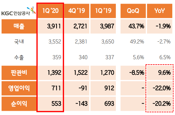 코로나 19로 쉽지 않았던 1분기 경영실적을 보면 KT&G의 담배 판매는 준수한 성적을 냈으나 계열사인 KGC(한국 인삼공사)는 순이익이 20% 가까이 급감하는 부진을 보였습니다. 코로나 19 확산으로 면세점 매출이 급감했고 홈쇼핑 등 비대면 채널 판매로 인한 비용 증가로 이익이 급감했다고 하네요.