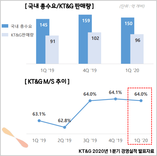 KT&G의 2020년 1분기 경영실적 발표자료에 따르면 KT&G 의 국내 담배판매시장 점유율은 64%로 압도적인 1위를 유지하고 있습니다. 전년동기 대비 0.9%가 상승한 수치입니다. 필립 모리스나 BAT 같은 글로벌 담배회사도 국내 한정 전매청 KT&G에게는 한 수 배워야 할 것 같습니다.
