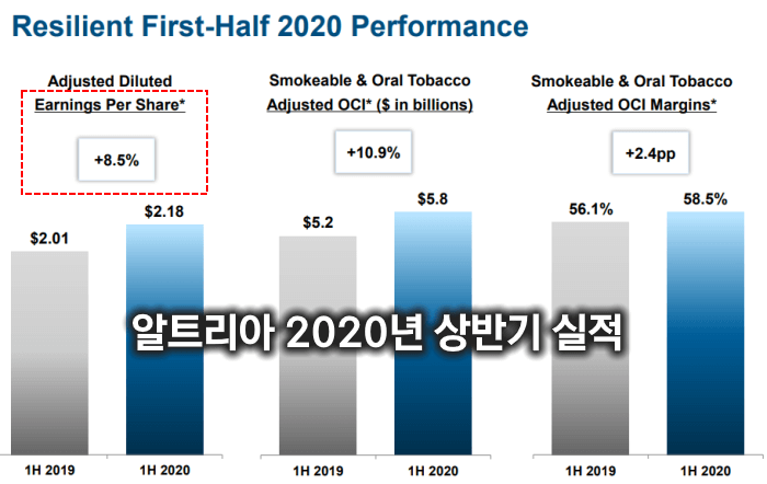 알트리아의 2020년 상반기 실적 발표자료에 의하면 전년 동기 대비해서 주당 순이익(EPS)이 8.5% 증가했다고 합니다. 담배 매출이 10.9% 증가했다고 하는데요. 말보로와 같은 연초담배 외에 씹는담배의 매출이 크게 늘어난 것으로 보입니다.