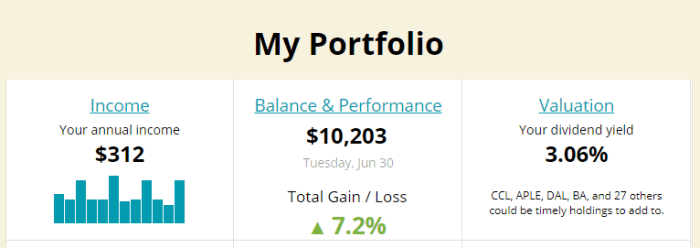 6월 한 달간 지급받은 배당금 정산 저는 현재 미국 주식 67개 종목에 $10,200 정도를 투자하고 있습니다. 배당수익률은 3.06%이고 연간 수령이 예상되는 배당금은 $312 정도입니다. 6월 한 달간 총 16��