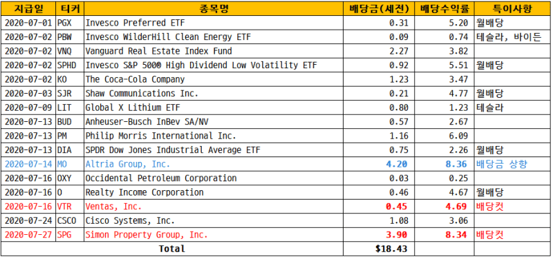 7월에는 ETF 포함하여 16개 종목에서 배당금이 입금되었습니다. 세전으로 $18.43이고 15.4% 배당소득세 제외하면 한화로 18,500원 수준입니다.