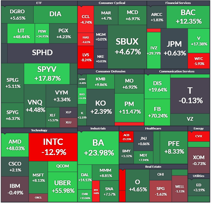 아래는 8월 4일 기준 제 미국 주식 포트폴리오를 트리 맵 차트로 그려본 그림입니다. 그림에서 사각형의 면적은 해당 종목의 전체 투자금액 대비 비중이고 %는 종목의 현재 투자 수익률을 나타냅니다.
