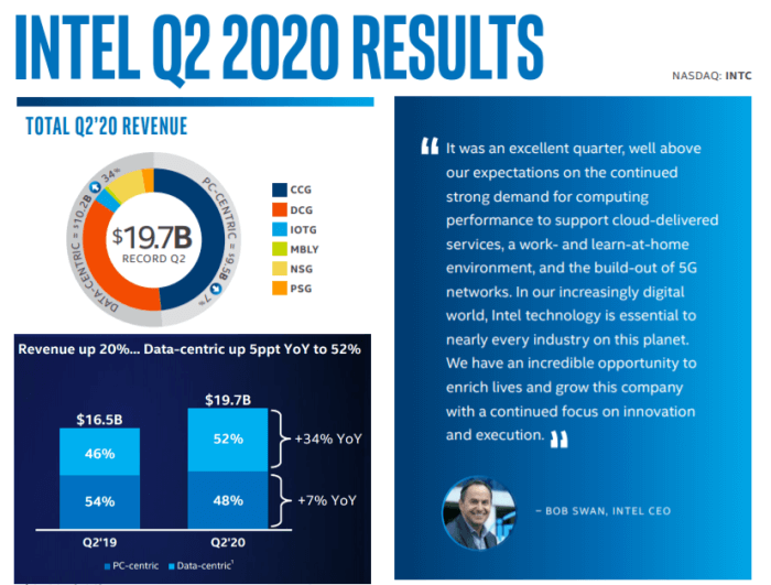 인텔의 2분기 매출과 주당 순이익은 전년 동기 대비해서 각각 20%, 16%가 증가하는 사실상 어닝 서프라이즈를 보여줬습니다. 인텔 CEO 인 밥 스완(Bob Swan)은 2분기 실적이 환상적이었다고 평가했으며 다가올 클라우드와 5G 네트워크로 대변되는 디지털 시대에 더 큰 성장이 기대된다고 밝혔습니다.