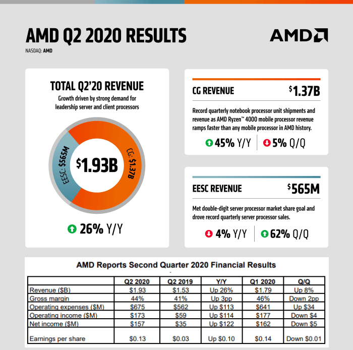 7월 28일 AMD의 2분기 실적 발표자료에 따르면 전년 동기 대비 매출은 26% 증가했고 순이익은 4배 넘게 증가했습니다. AMD의 2분기 매출은 $1.93B이고 주당 순이익은 $0.13입니다.