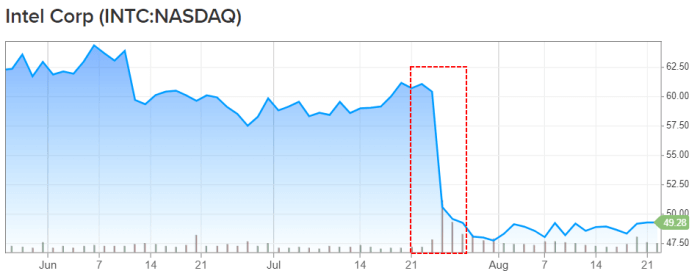 실적 발표 다음날인 7월 24일, 인텔의 주가는 하루 만에 17% 하락합니다.